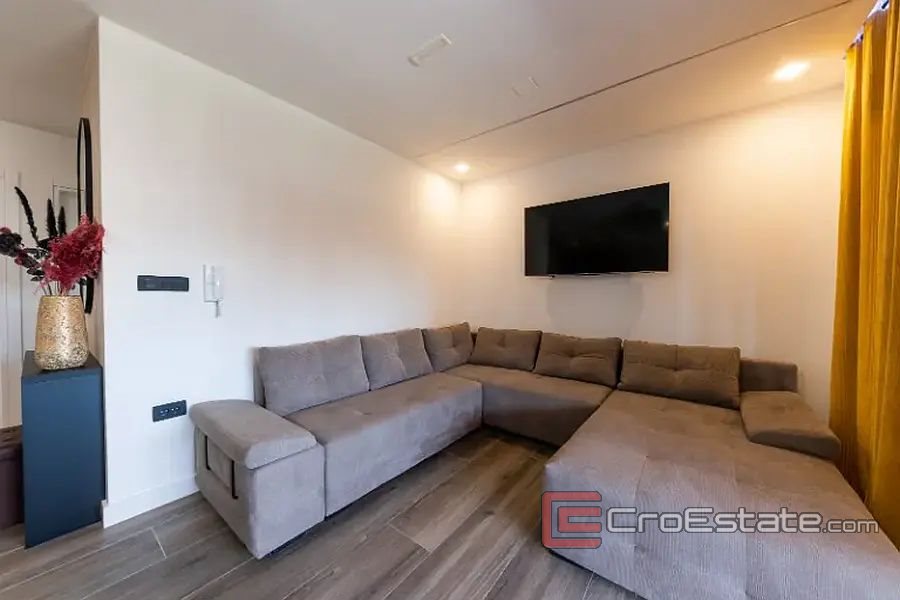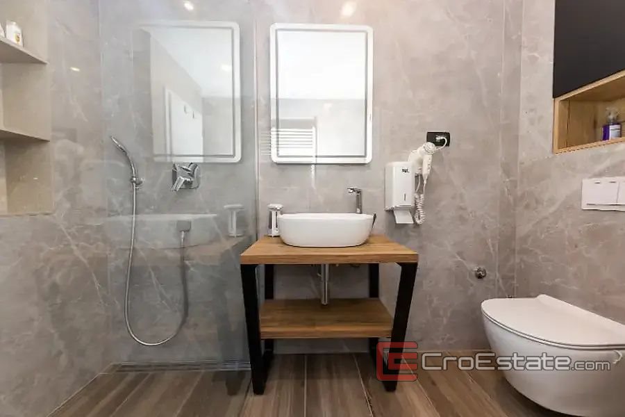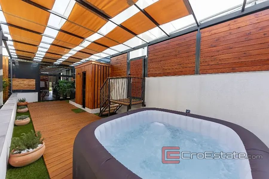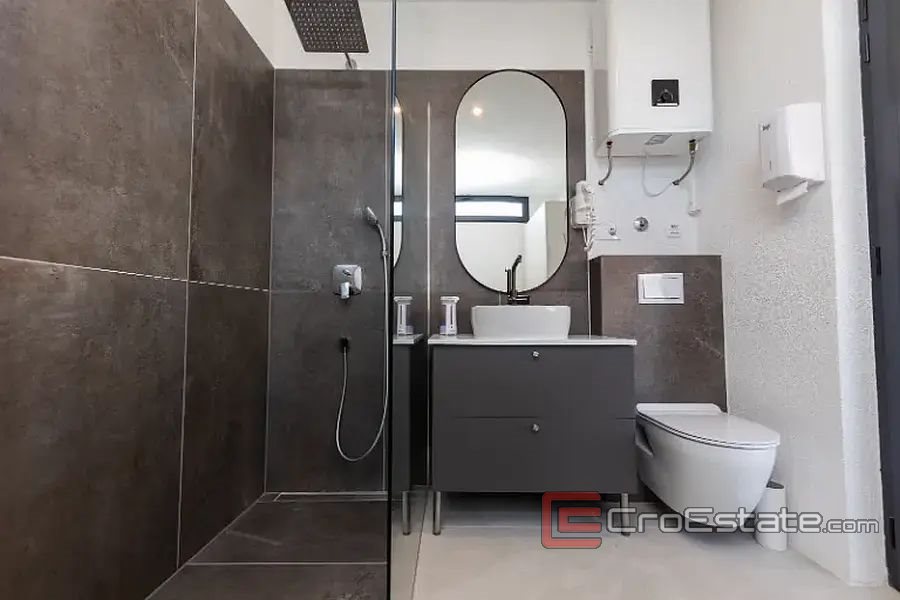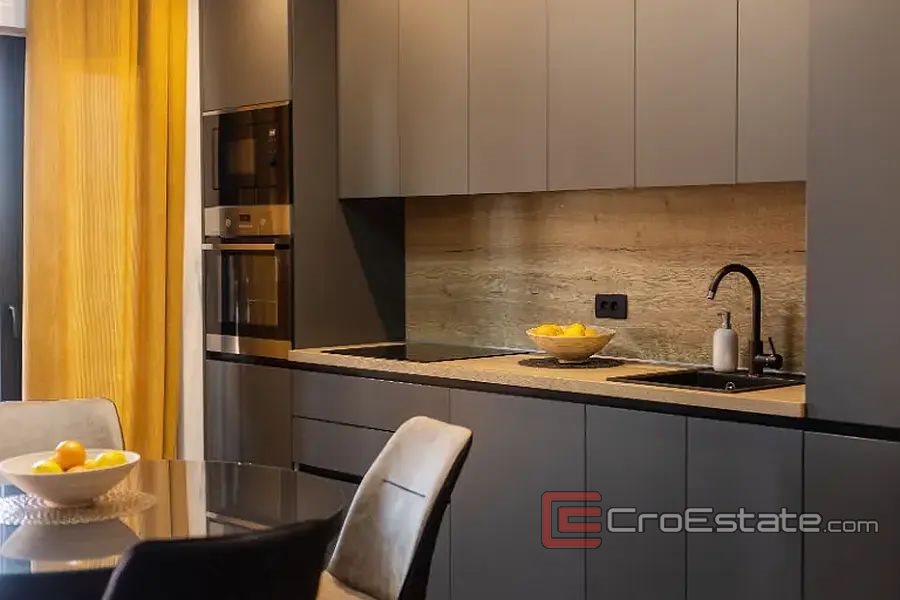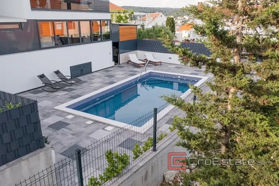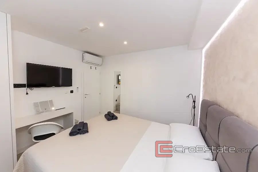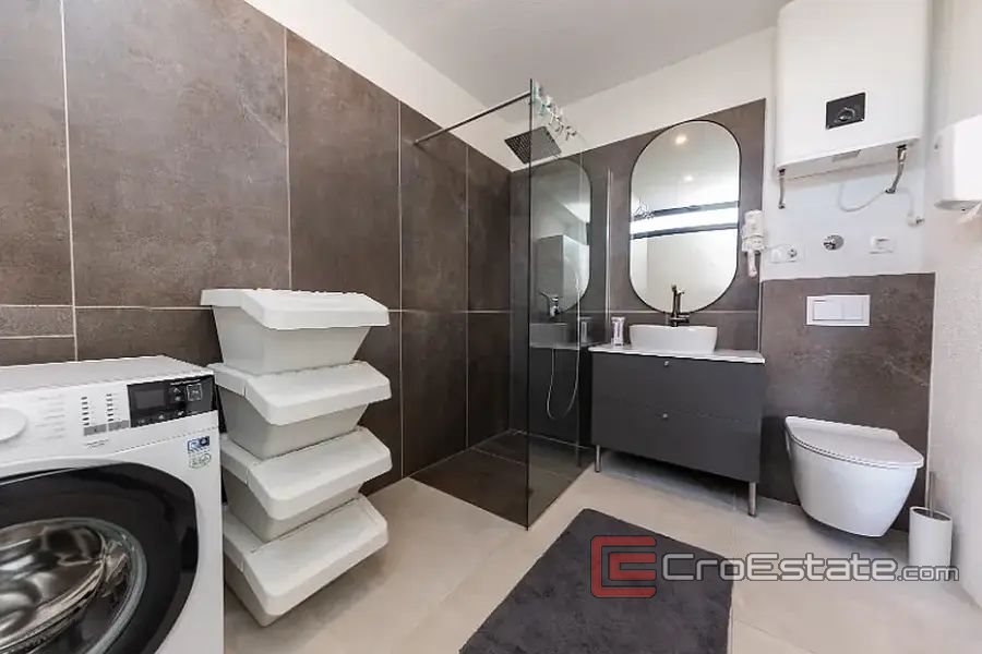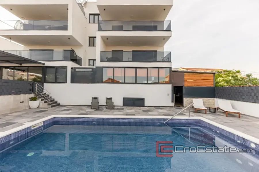 In a new building, a modern apartment 150 m away from the sea on the south side of the island of Ciovo. Located on the ground floor of a smaller new building, the apartment has an area of 195 m2 and consists of a hallway, two bathrooms, two bedrooms, and a kitchen with a dining room and a living room, from which there is access to a beautifully decorated area with access to the summer kitchen, dining room, space for barbecue and Jacuzzi. The apartment has direct access to the communal pool. The apartment has one parking space for two cars. The apartment is sold fully furnished. The apartment is ideal for tourist rental because it is close to all facilities and only 15 kilometers from the airport.
